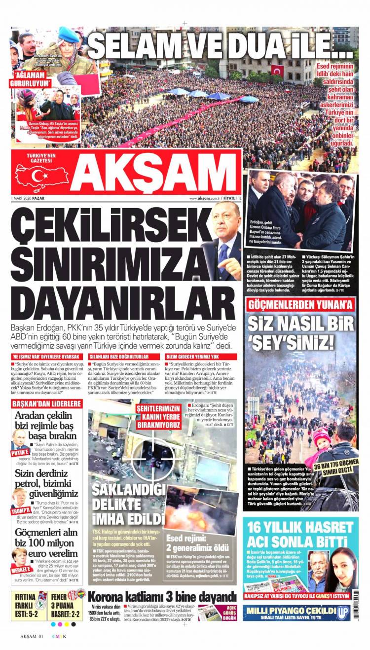 * Günün Ulusal Gazete Manşetleri – 01 03 2020Ulusal Gazetelerin 1. sayfaları Haber Merkezi Yayınlanma: 01.03.2020 - 11:50 Son güncellenme: 28.01.2025 - 23:24 Akşam