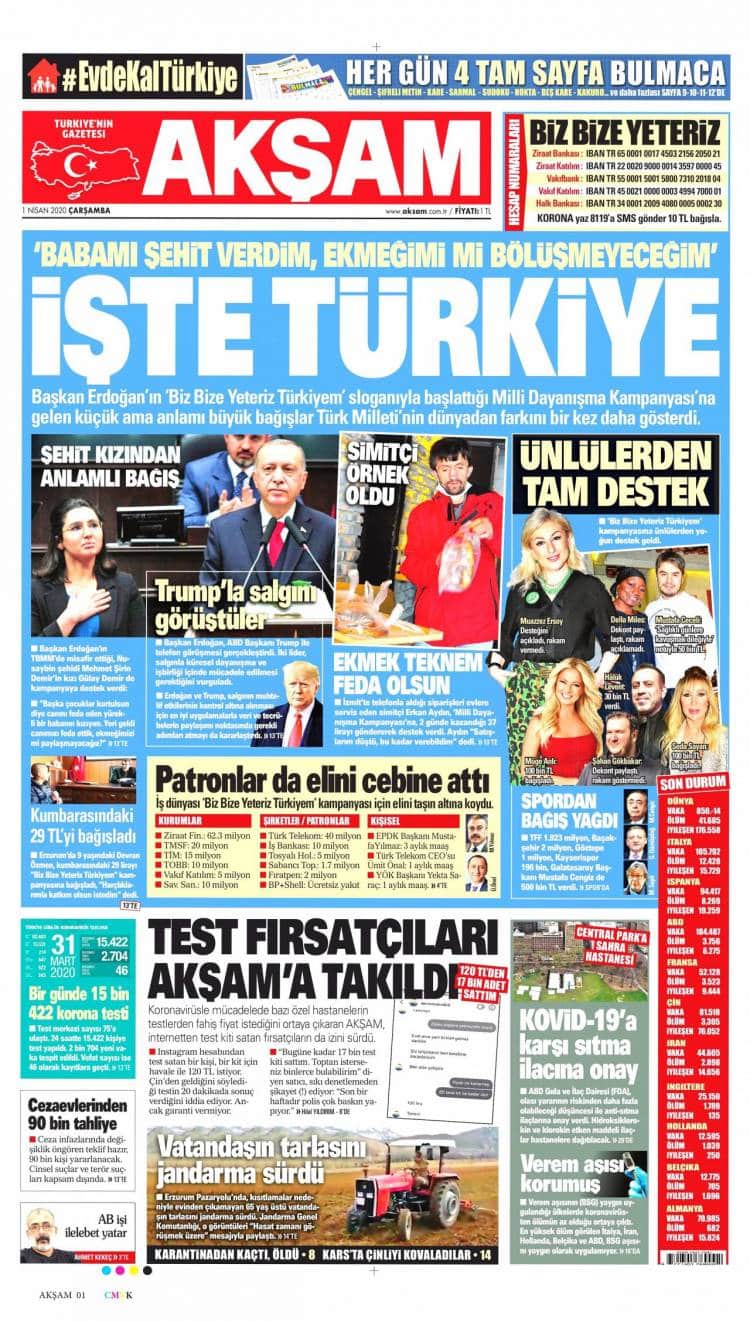 Günün Ulusal Gazete Manşetleri – 01 04 2020Ulusal Gazetelerin 1. sayfaları Haber Merkezi Yayınlanma: 01.04.2020 - 11:50 Son güncellenme: 28.01.2025 - 22:59 Akşam