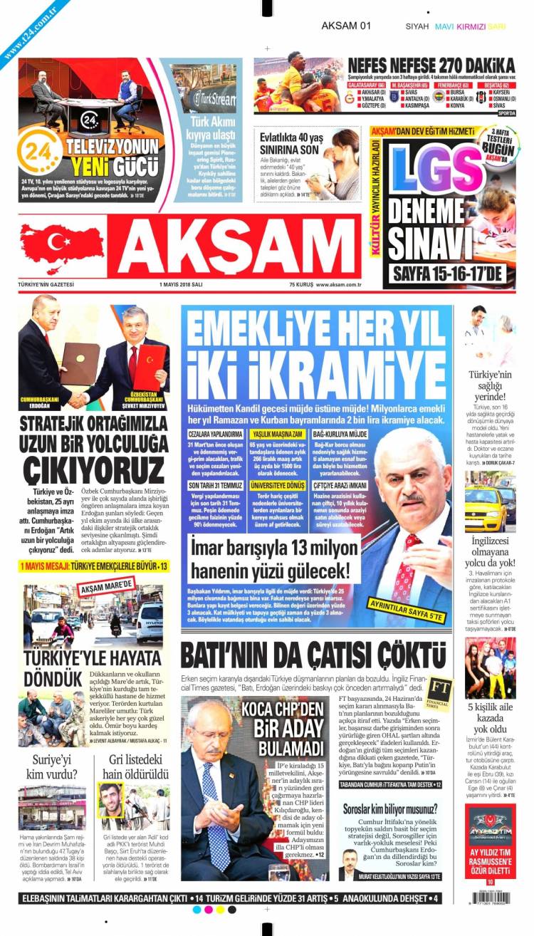 * Günün Ulusal Gazete Manşetleri – 01 05 2018Ulusal Gazetelerin 1. sayfaları Haber Merkezi Yayınlanma: 01.05.2018 - 11:50 Son güncellenme: 29.01.2025 - 10:05 Akşam