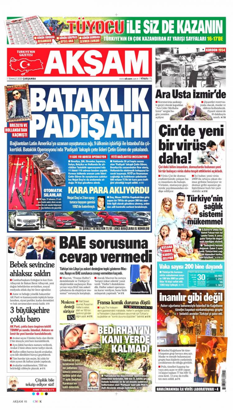 * Günün Ulusal Gazete Manşetleri – 01 07 2020Ulusal Gazetelerin 1. sayfaları Haber Merkezi Yayınlanma: 01.07.2020 - 11:50 Son güncellenme: 28.01.2025 - 21:34 Akşam