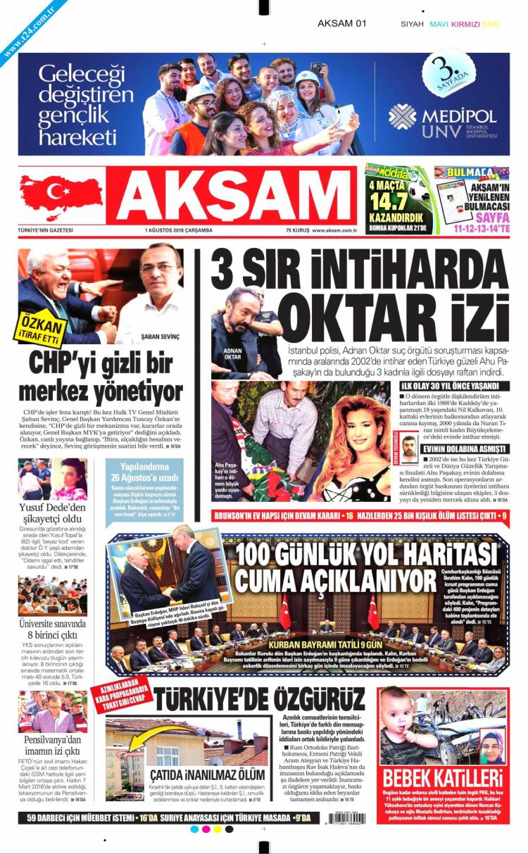 * Günün Ulusal Gazete Manşetleri – 01 08 2018Ulusal Gazetelerin 1. sayfaları Haber Merkezi Yayınlanma: 01.08.2018 - 11:50 Son güncellenme: 29.01.2025 - 08:11 Akşam
