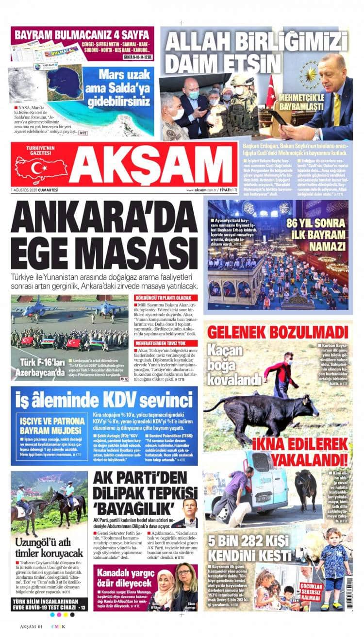 * Günün Ulusal Gazete Manşetleri – 01 08 2020Ulusal Gazetelerin 1. sayfaları Haber Merkezi Yayınlanma: 01.08.2020 - 11:50 Son güncellenme: 28.01.2025 - 21:05 Akşam