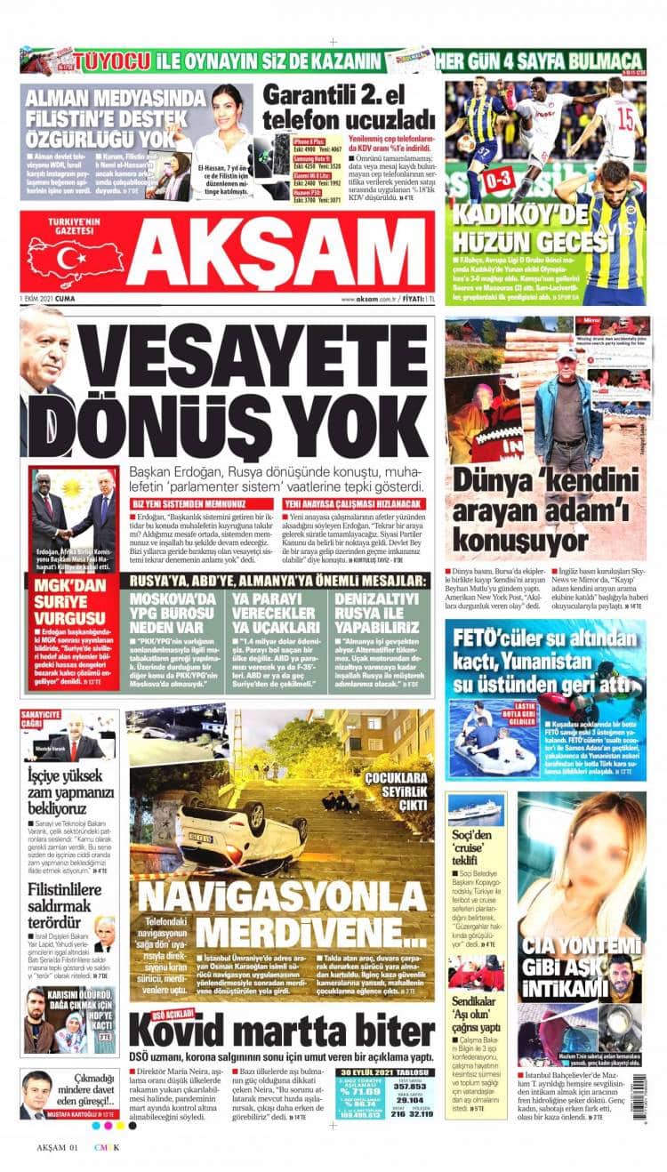 * Günün Ulusal Gazete Manşetleri – 01 10 2021Ulusal Gazetelerin 1. sayfaları Haber Merkezi Yayınlanma: 01.10.2021 - 11:50 Son güncellenme: 28.01.2025 - 15:02 Akşam