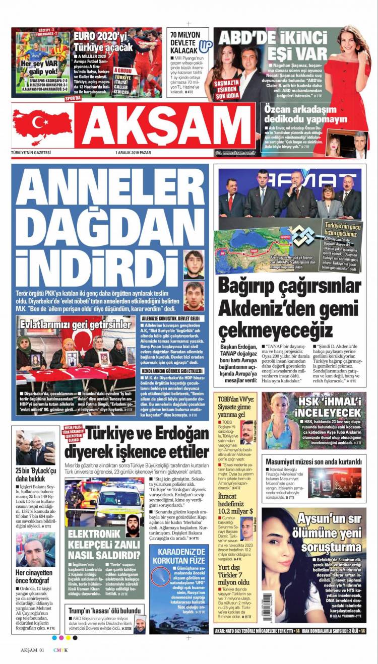 * Günün Ulusal Gazete Manşetleri – 01 12 2019Ulusal Gazetelerin 1. sayfaları Haber Merkezi Yayınlanma: 01.12.2019 - 11:50 Son güncellenme: 29.01.2025 - 00:17 Akşam