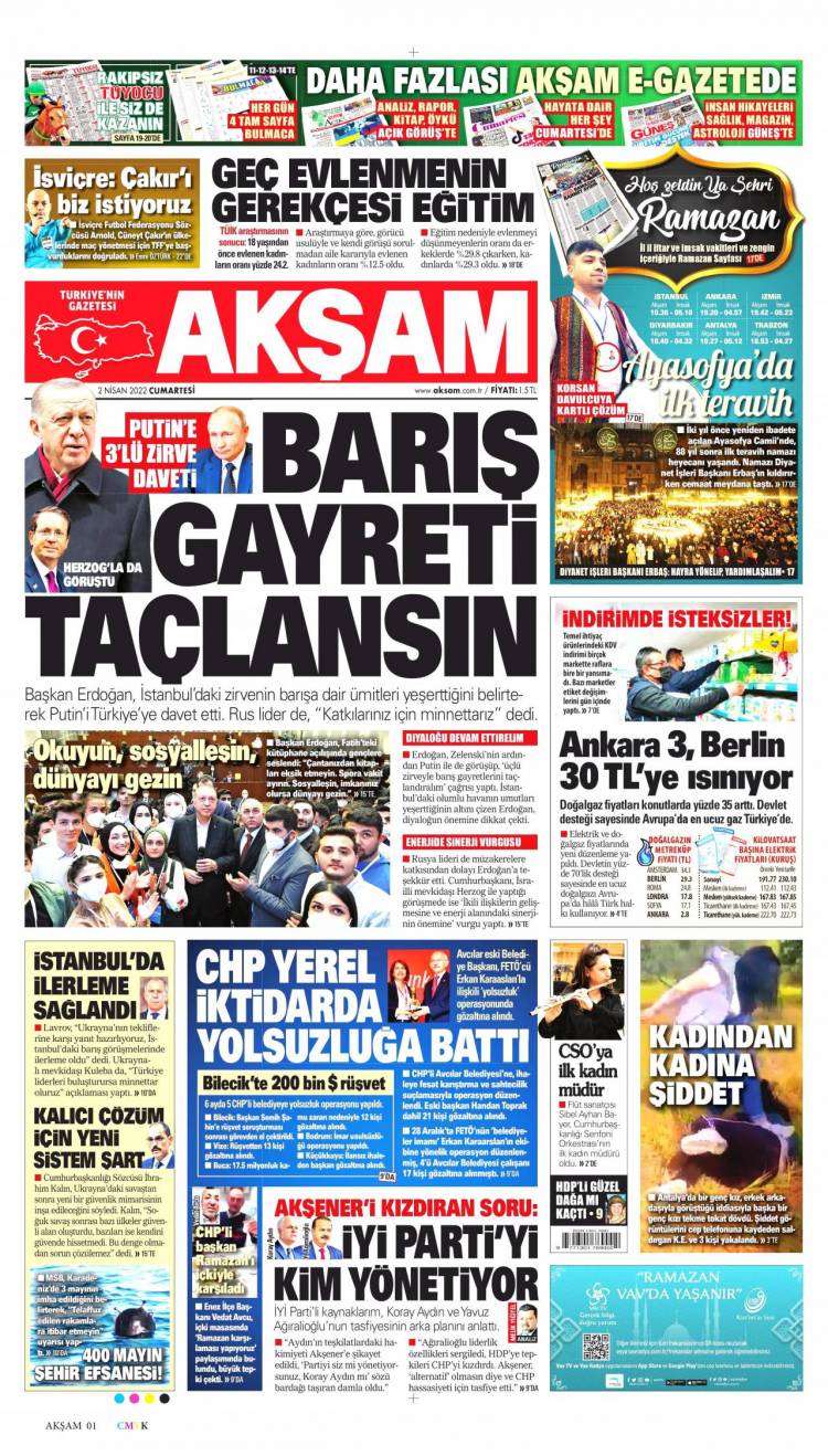 Günün Ulusal Gazete Manşetleri – 02 04 2022Ulusal Gazetelerin 1. sayfaları Haber Merkezi Yayınlanma: 02.04.2022 - 11:50 Son güncellenme: 28.01.2025 - 12:27 Akşam