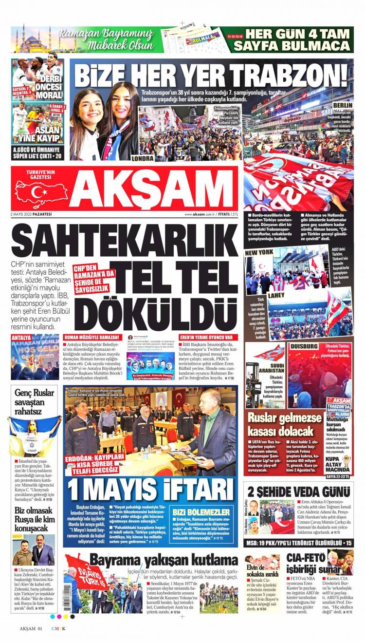 Günün Ulusal Gazete Manşetleri – 02 05 2022Ulusal Gazetelerin 1. sayfaları Haber Merkezi Yayınlanma: 02.05.2022 - 11:50 Son güncellenme: 28.01.2025 - 12:01 Akşam