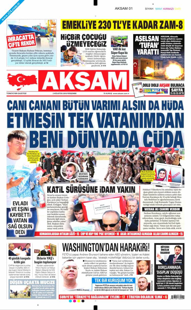 * Günün Ulusal Gazete Manşetleri – 02 08 2018Ulusal Gazetelerin 1. sayfaları Haber Merkezi Yayınlanma: 02.08.2018 - 11:50 Son güncellenme: 29.01.2025 - 08:10 Akşam