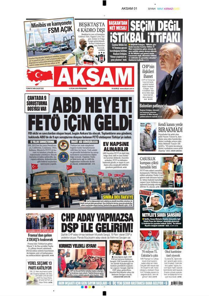 * Günün Ulusal Gazete Manşetleri – 03 01 2019Ulusal Gazetelerin 1. sayfaları Haber Merkezi Yayınlanma: 03.01.2019 - 11:50 Son güncellenme: 29.01.2025 - 05:11 Akşam