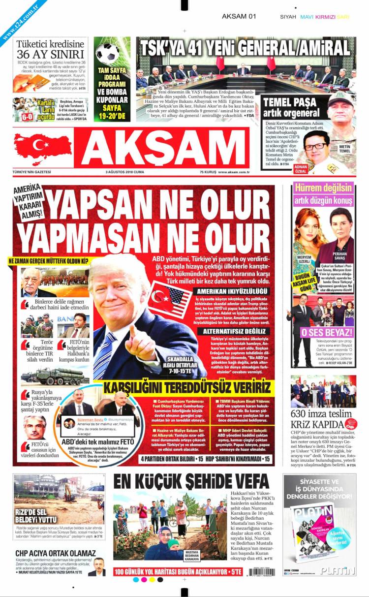 Günün Ulusal Gazete Manşetleri – 03 08 2018Ulusal Gazetelerin 1. sayfaları Haber Merkezi Yayınlanma: 03.08.2018 - 11:50 Son güncellenme: 29.01.2025 - 08:09 Akşam