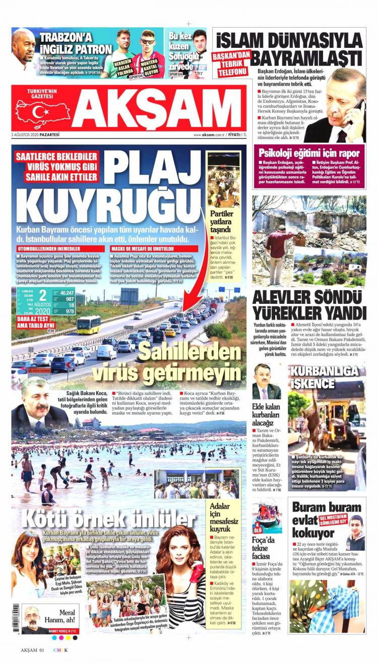 Günün Ulusal Gazete Manşetleri – 03 08 2020Ulusal Gazetelerin 1. sayfaları Haber Merkezi Yayınlanma: 03.08.2020 - 11:50 Son güncellenme: 28.01.2025 - 21:03 Akşam