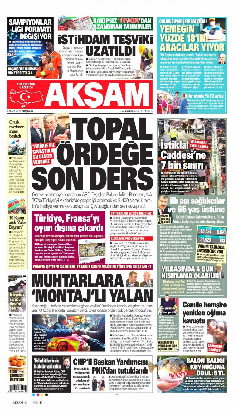 * Günün Ulusal Gazete Manşetleri – 03 12 2020Ulusal Gazetelerin 1. sayfaları Haber Merkezi Yayınlanma: 03.12.2020 - 11:50 Son güncellenme: 28.01.2025 - 19:16 Akşam