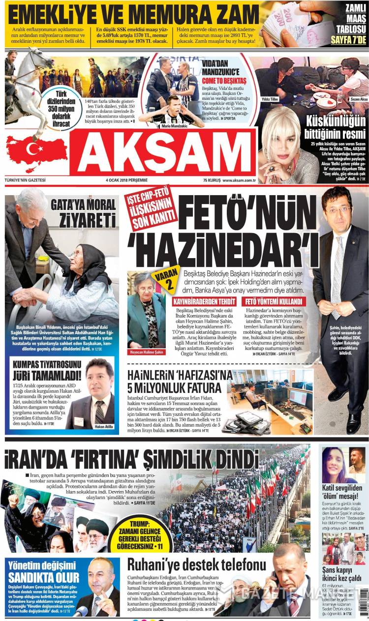 * Günün Ulusal Gazete Manşetleri – 04 01 2018Ulusal Gazetelerin 1. sayfaları Haber Merkezi Yayınlanma: 04.01.2018 - 11:50 Son güncellenme: 29.01.2025 - 13:34 Akşam