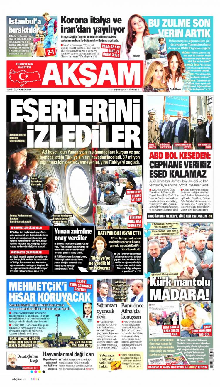* Günün Ulusal Gazete Manşetleri – 04 03 2020Ulusal Gazetelerin 1. sayfaları Haber Merkezi Yayınlanma: 04.03.2020 - 11:50 Son güncellenme: 28.01.2025 - 23:22 Akşam