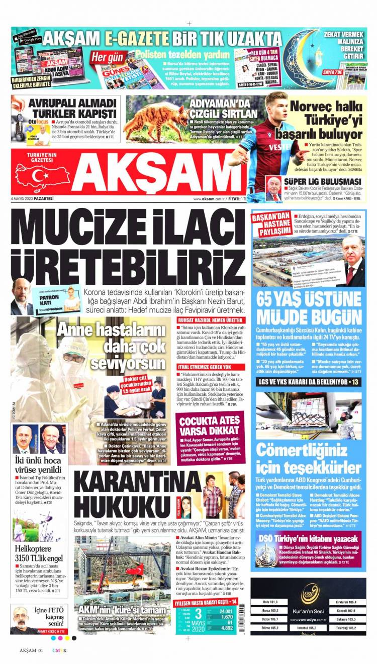 * Günün Ulusal Gazete Manşetleri – 04 05 2020Ulusal Gazetelerin 1. sayfaları Haber Merkezi Yayınlanma: 04.05.2020 - 11:50 Son güncellenme: 28.01.2025 - 22:31 Akşam