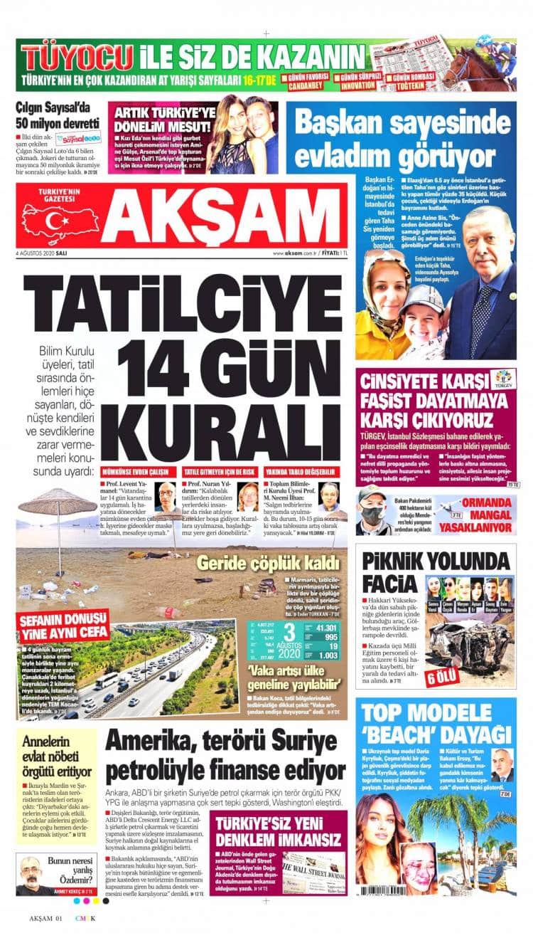 Günün Ulusal Gazete Manşetleri – 04 08 2020Ulusal Gazetelerin 1. sayfaları Haber Merkezi Yayınlanma: 04.08.2020 - 11:50 Son güncellenme: 28.01.2025 - 21:02 Akşam