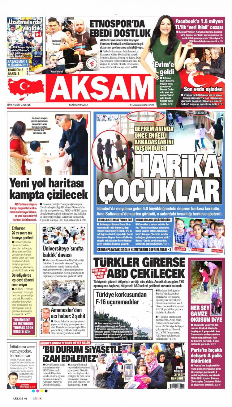* Günün Ulusal Gazete Manşetleri – 04 10 2019Ulusal Gazetelerin 1. sayfaları Haber Merkezi Yayınlanma: 04.10.2019 - 11:50 Son güncellenme: 29.01.2025 - 01:05 Akşam