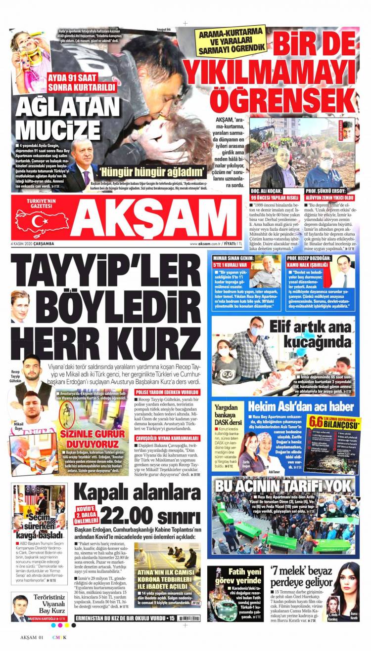 * Günün Ulusal Gazete Manşetleri – 04 11 2020Ulusal Gazetelerin 1. sayfaları Haber Merkezi Yayınlanma: 04.11.2020 - 11:50 Son güncellenme: 28.01.2025 - 19:40 Akşam