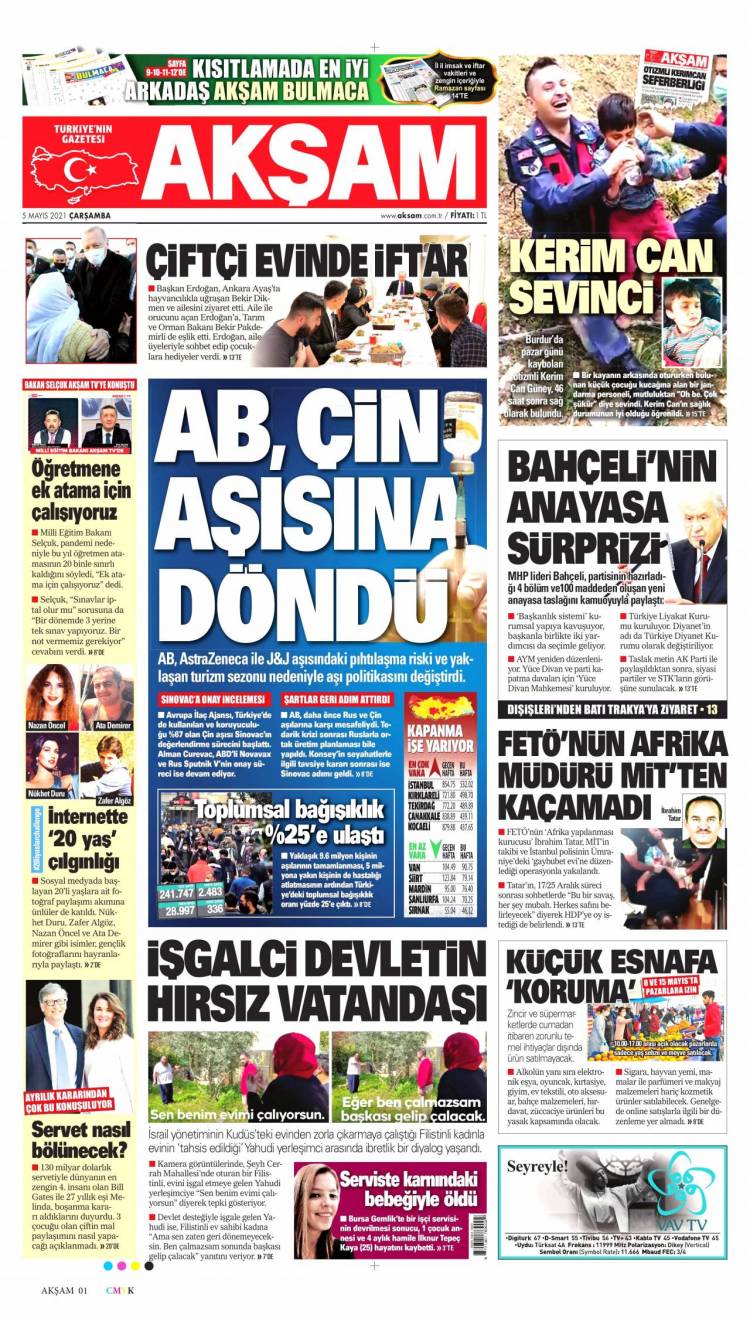 * Günün Ulusal Gazete Manşetleri – 05 05 2021Ulusal Gazetelerin 1. sayfaları Haber Merkezi Yayınlanma: 05.05.2021 - 11:50 Son güncellenme: 28.01.2025 - 17:06 Akşam