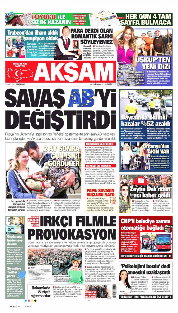 Günün Ulusal Gazete Manşetleri – 05 05 2022Ulusal Gazetelerin 1. sayfaları Haber Merkezi Yayınlanma: 05.05.2022 - 11:50 Son güncellenme: 28.01.2025 - 11:58 Akşam
