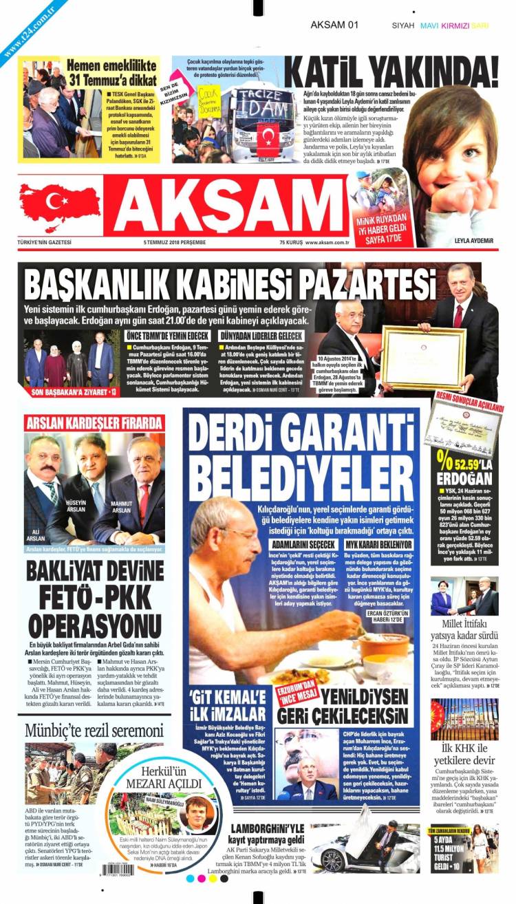 * Günün Ulusal Gazete Manşetleri – 05 07 2018Ulusal Gazetelerin 1. sayfaları Haber Merkezi Yayınlanma: 05.07.2018 - 11:50 Son güncellenme: 29.01.2025 - 08:45 Akşam