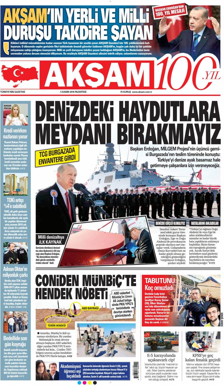 * Günün Ulusal Gazete Manşetleri – 05 11 2018Ulusal Gazetelerin 1. sayfaları Haber Merkezi Yayınlanma: 05.11.2018 - 11:50 Son güncellenme: 29.01.2025 - 06:14 Akşam