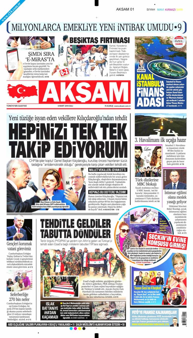 * Günün Ulusal Gazete Manşetleri – 06 03 2018Ulusal Gazetelerin 1. sayfaları Haber Merkezi Yayınlanma: 06.03.2018 - 11:50 Son güncellenme: 29.01.2025 - 11:27 Akşam