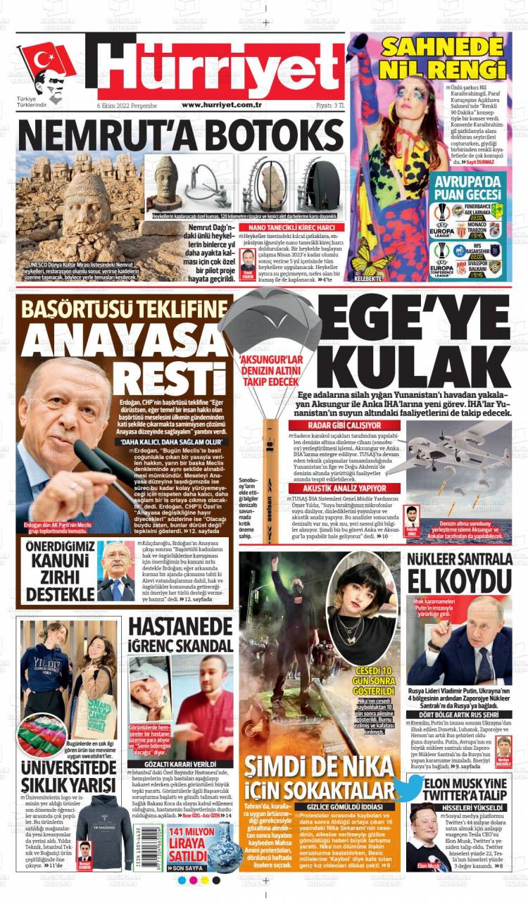 * Günün Ulusal Gazete Manşetleri – 07 10 2022Ulusal Gazetelerin 1. sayfaları Haber Merkezi Yayınlanma: 07.10.2022 - 11:50 Son güncellenme: 28.01.2025 - 09:50 Hürriyet