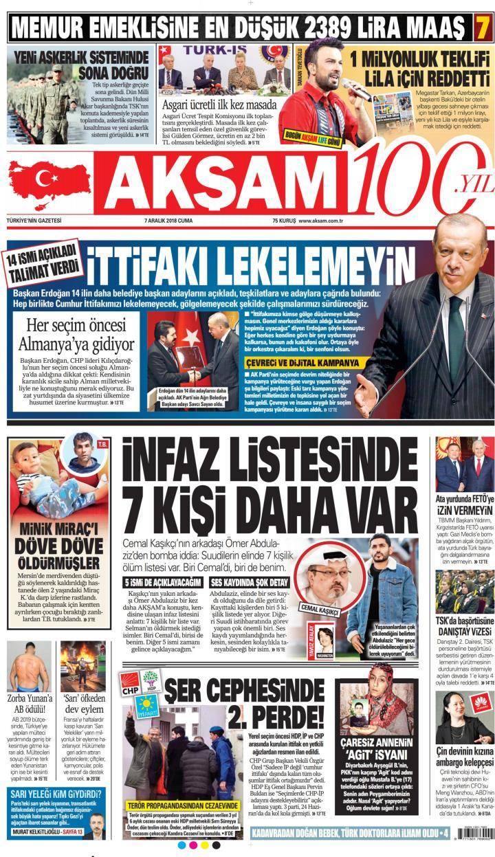 * Günün Ulusal Gazete Manşetleri – 07 12 2018Ulusal Gazetelerin 1. sayfaları Haber Merkezi Yayınlanma: 07.12.2018 - 11:50 Son güncellenme: 29.01.2025 - 05:37 Akşam