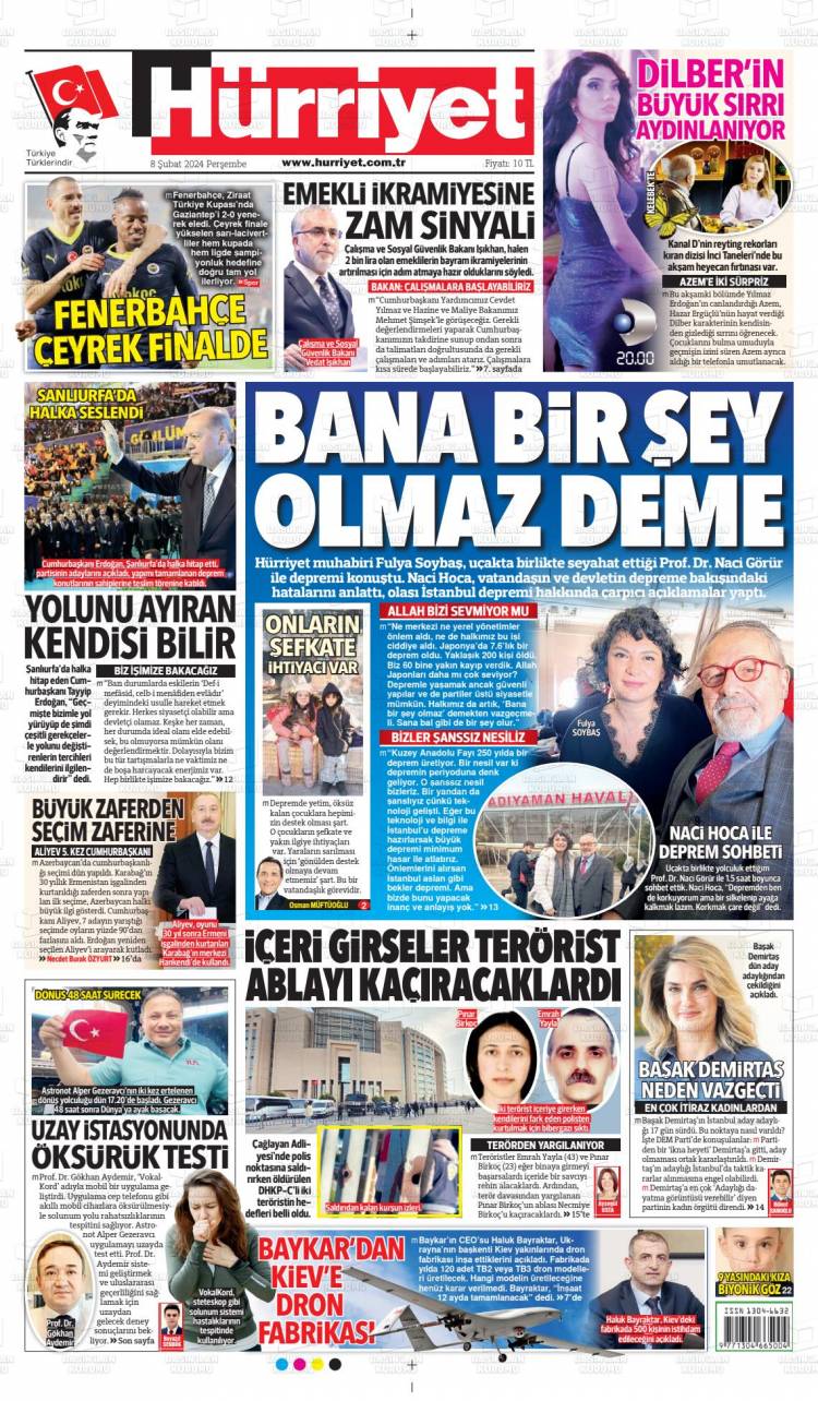 Günün Ulusal Gazete Manşetleri – 08 02 2024Ulusal Gazetelerin 1. sayfaları Haber Merkezi Yayınlanma: 08.02.2024 - 11:50 Son güncellenme: 28.01.2025 - 03:10 Hürriyet