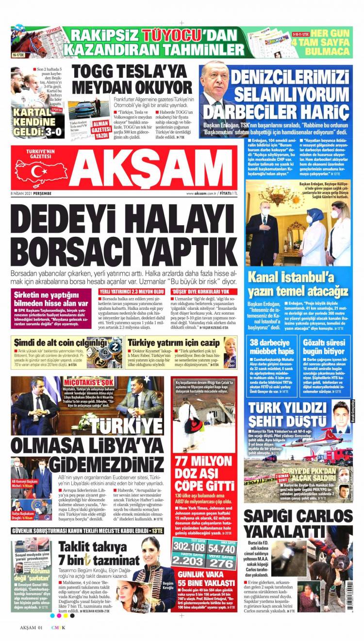 * Günün Ulusal Gazete Manşetleri – 08 04 2021Ulusal Gazetelerin 1. sayfaları Haber Merkezi Yayınlanma: 08.04.2021 - 11:50 Son güncellenme: 28.01.2025 - 17:29 Akşam