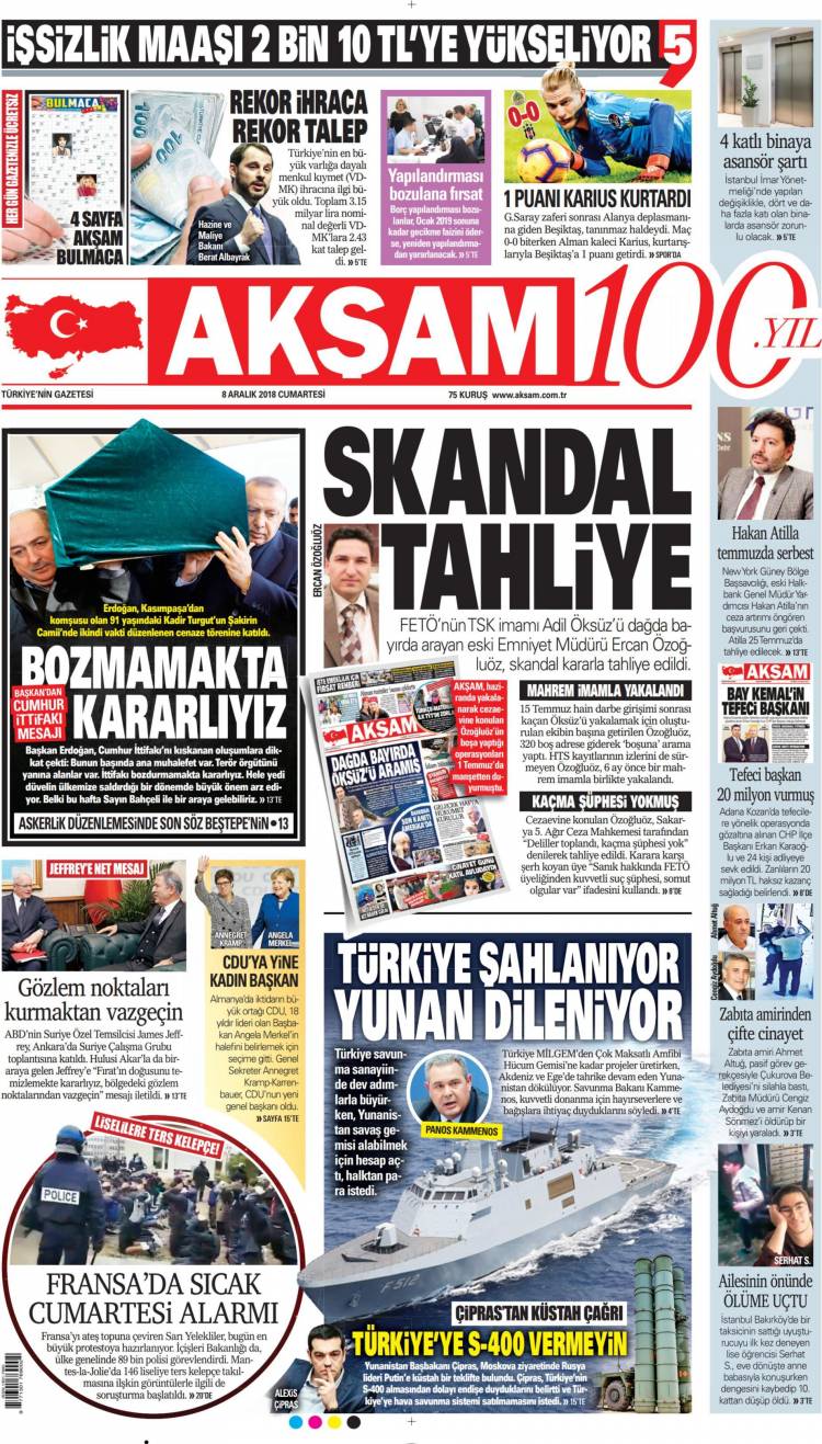 Günün Ulusal Gazete Manşetleri – 08 12 2018Ulusal Gazetelerin 1. sayfaları Haber Merkezi Yayınlanma: 08.12.2018 - 11:50 Son güncellenme: 29.01.2025 - 05:35 Akşam