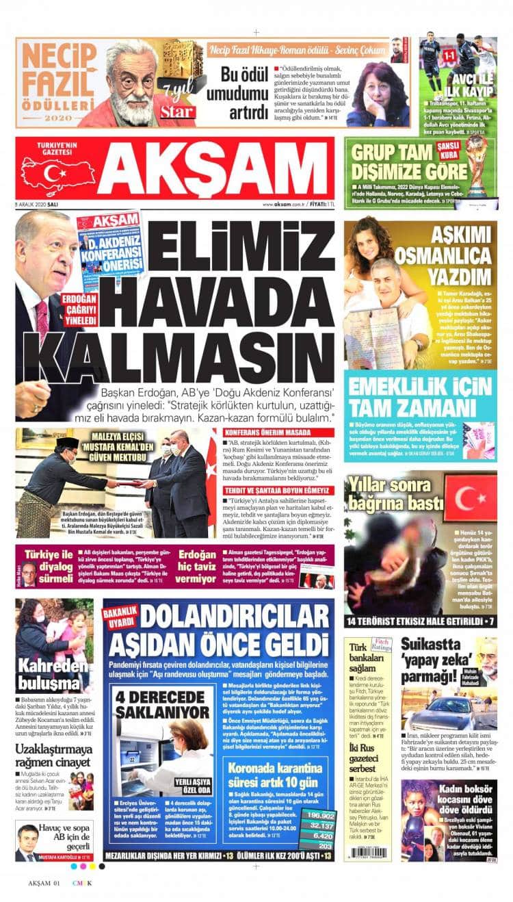 * Günün Ulusal Gazete Manşetleri – 08 12 2020Ulusal Gazetelerin 1. sayfaları Haber Merkezi Yayınlanma: 08.12.2020 - 11:50 Son güncellenme: 28.01.2025 - 19:12 Akşam