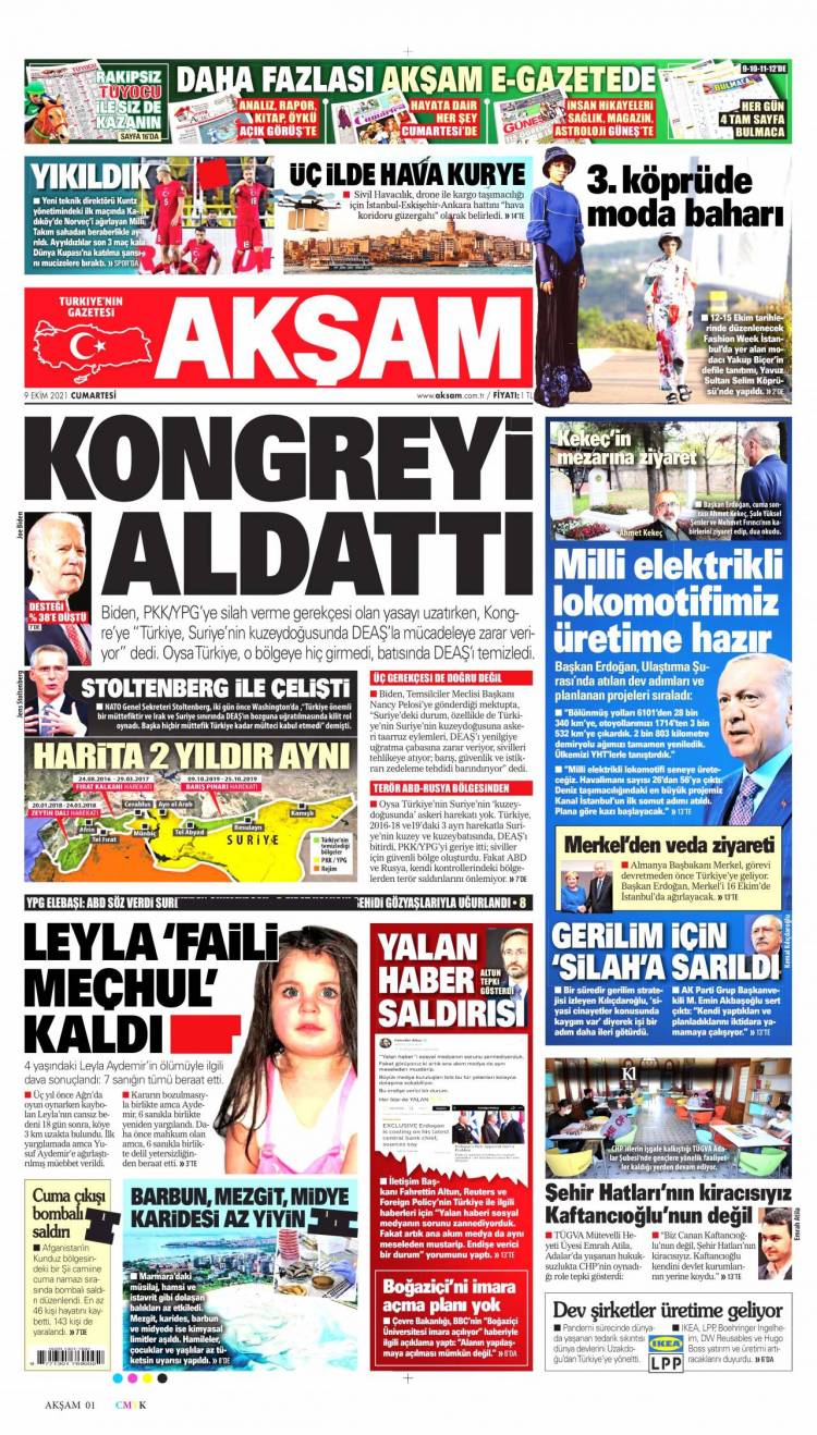 * Günün Ulusal Gazete Manşetleri – 09 10 2021Ulusal Gazetelerin 1. sayfaları Haber Merkezi Yayınlanma: 09.10.2021 - 11:50 Son güncellenme: 28.01.2025 - 14:55 Akşam