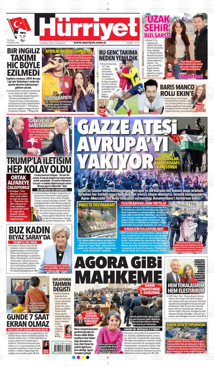 Günün Ulusal Gazete Manşetleri – 09 11 2024Ulusal Gazetelerin 1. sayfaları Haber Merkezi Yayınlanma: 09.11.2024 - 11:50 Son güncellenme: 27.01.2025 - 23:20 Hürriyet