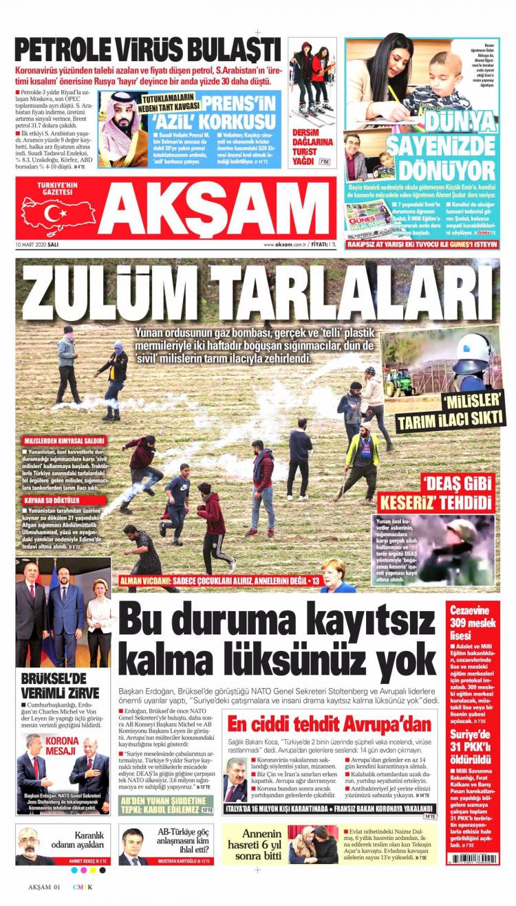 * Günün Ulusal Gazete Manşetleri – 10 03 2020Ulusal Gazetelerin 1. sayfaları Haber Merkezi Yayınlanma: 10.03.2020 - 11:50 Son güncellenme: 28.01.2025 - 23:16 Akşam