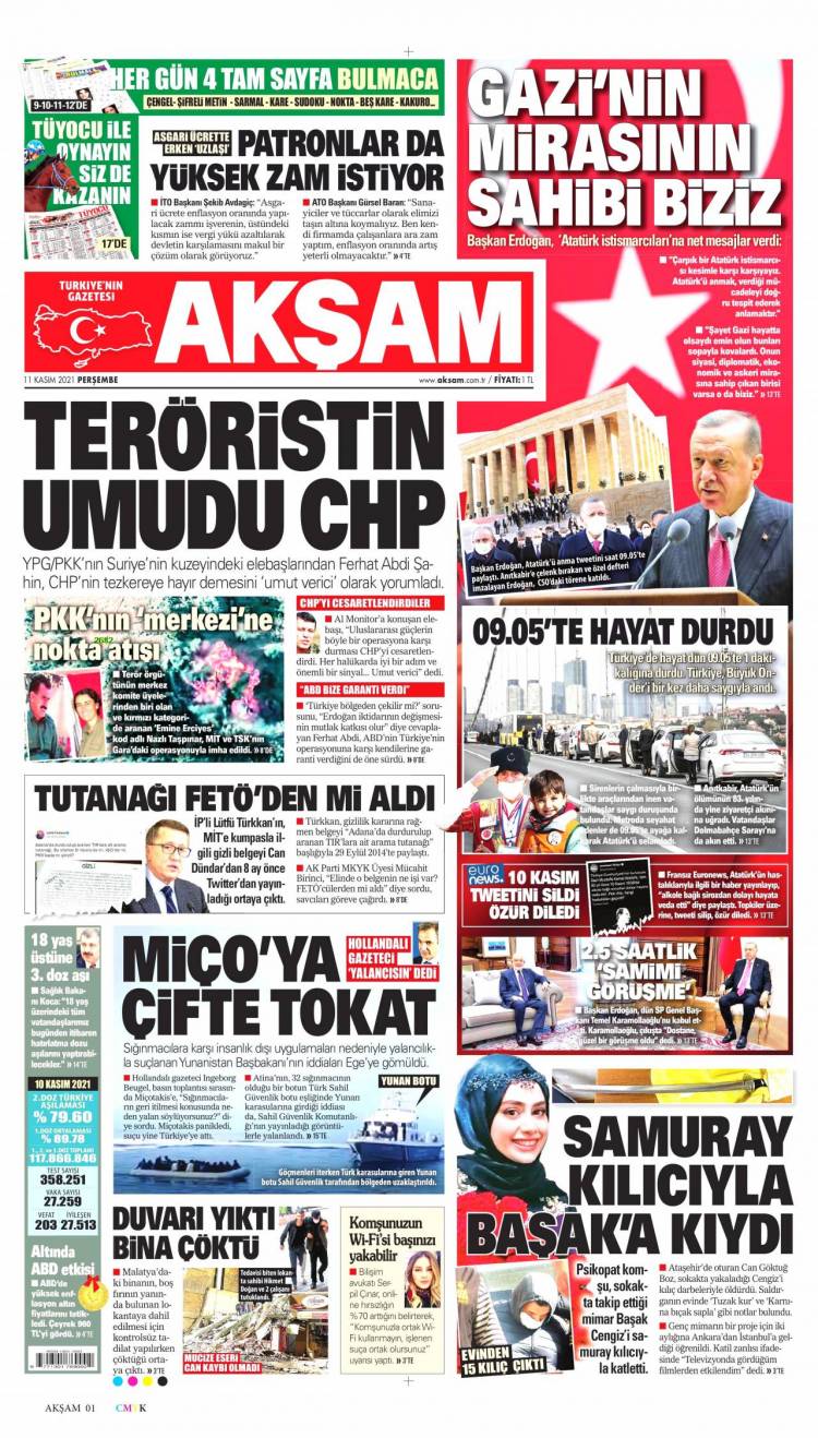 * Günün Ulusal Gazete Manşetleri – 11 11 2021Ulusal Gazetelerin 1. sayfaları Haber Merkezi Yayınlanma: 11.11.2021 - 11:50 Son güncellenme: 28.01.2025 - 14:27 Akşam