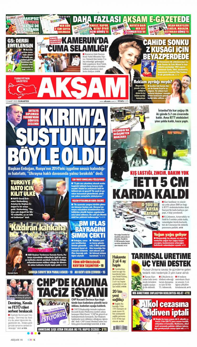 Günün Ulusal Gazete Manşetleri – 12 03 2022Ulusal Gazetelerin 1. sayfaları Haber Merkezi Yayınlanma: 12.03.2022 - 11:50 Son güncellenme: 28.01.2025 - 12:45 Akşam