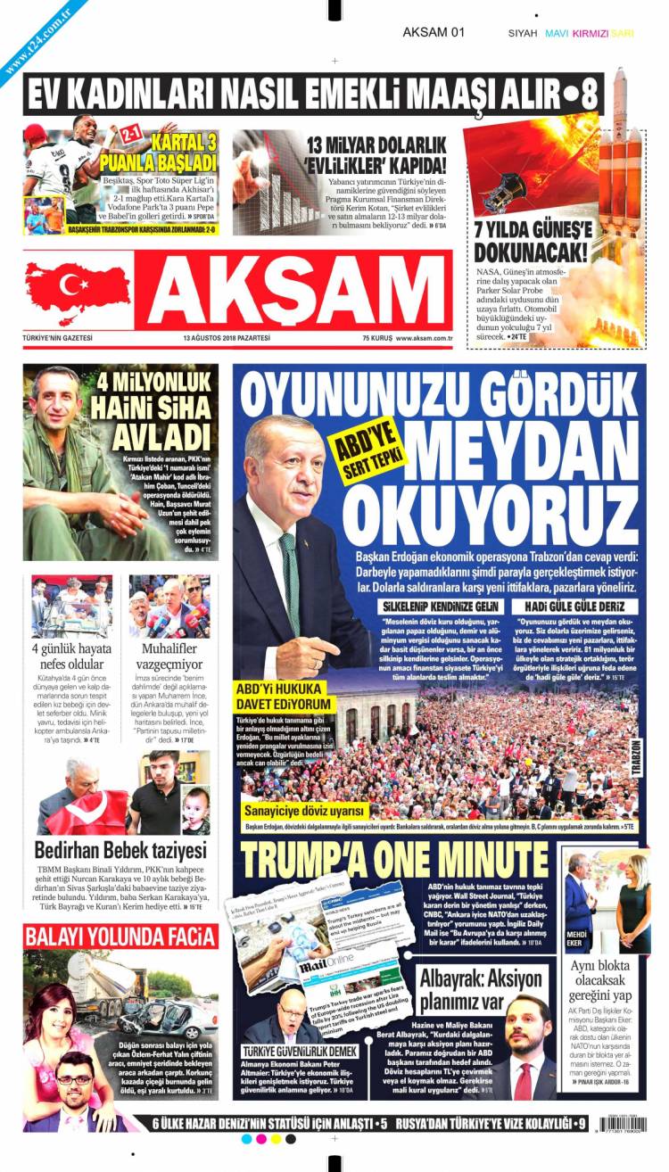 * Günün Ulusal Gazete Manşetleri – 13 08 2018Ulusal Gazetelerin 1. sayfaları Haber Merkezi Yayınlanma: 13.08.2018 - 11:50 Son güncellenme: 29.01.2025 - 07:56 Akşam