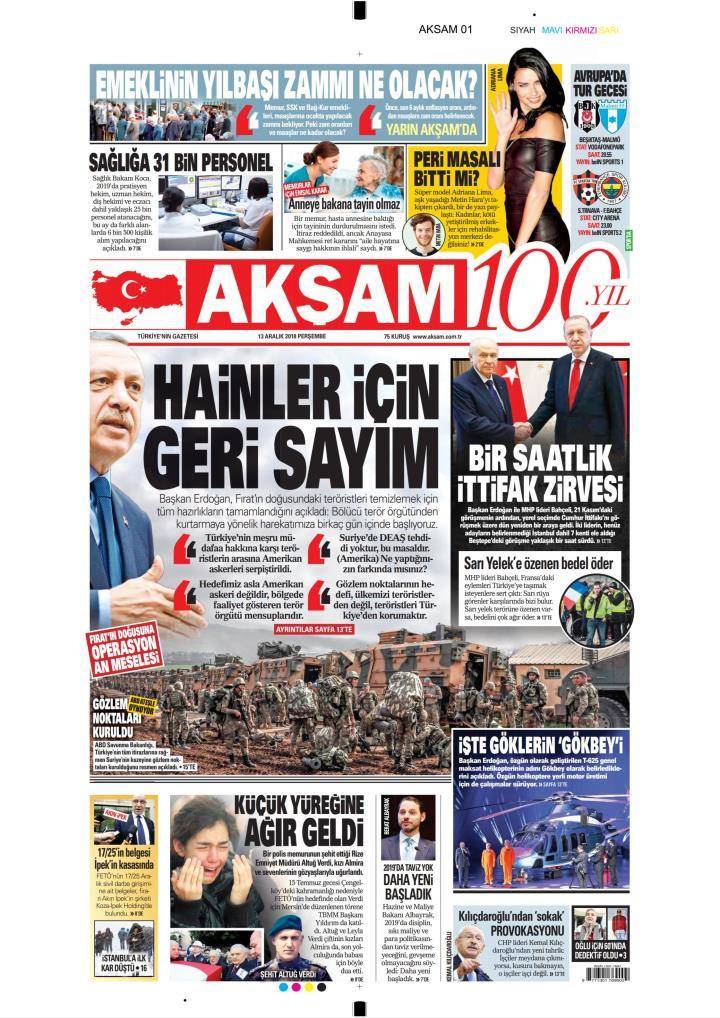 * Günün Ulusal Gazete Manşetleri – 13 12 2018Ulusal Gazetelerin 1. sayfaları Haber Merkezi Yayınlanma: 13.12.2018 - 11:50 Son güncellenme: 29.01.2025 - 05:31 Akşam