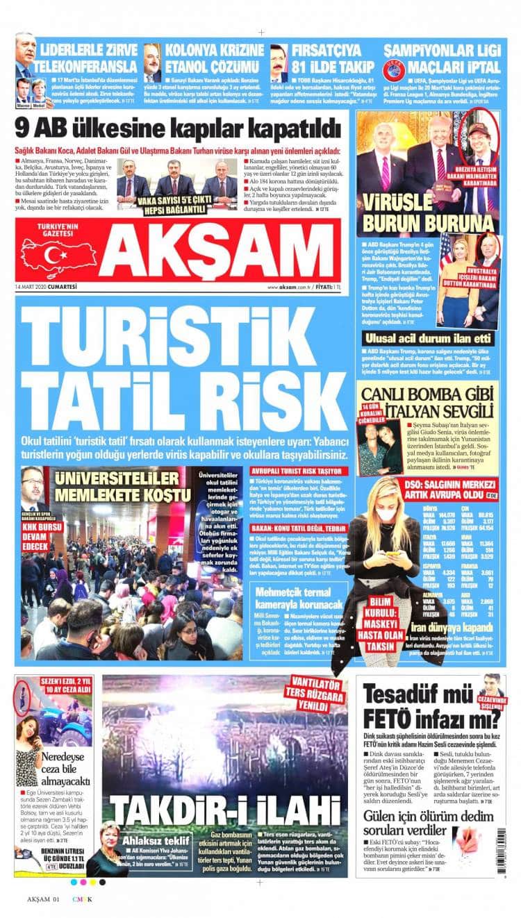 * Günün Ulusal Gazete Manşetleri – 14 03 2020Ulusal Gazetelerin 1. sayfaları Haber Merkezi Yayınlanma: 14.03.2020 - 11:50 Son güncellenme: 28.01.2025 - 23:13 Akşam