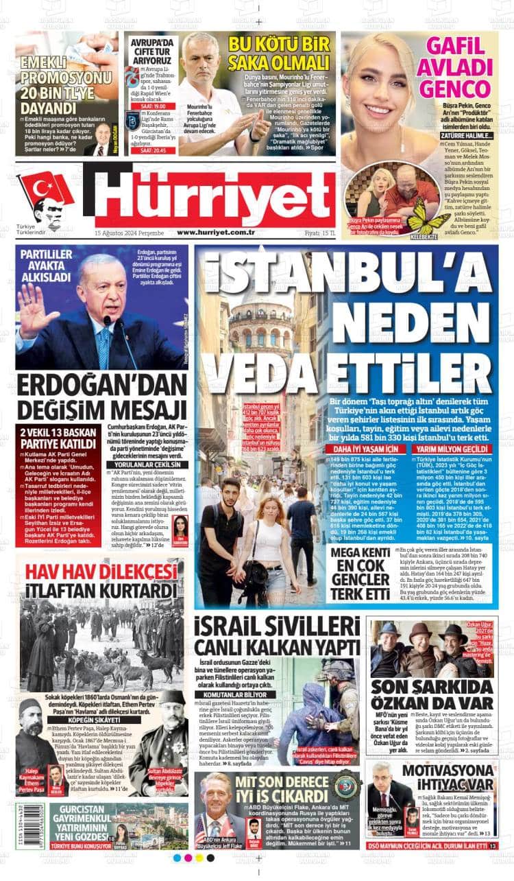 Günün Ulusal Gazete Manşetleri – 15 08 2024Ulusal Gazetelerin 1. sayfaları Haber Merkezi Yayınlanma: 15.08.2024 - 11:50 Son güncellenme: 28.01.2025 - 00:31 Hürriyet