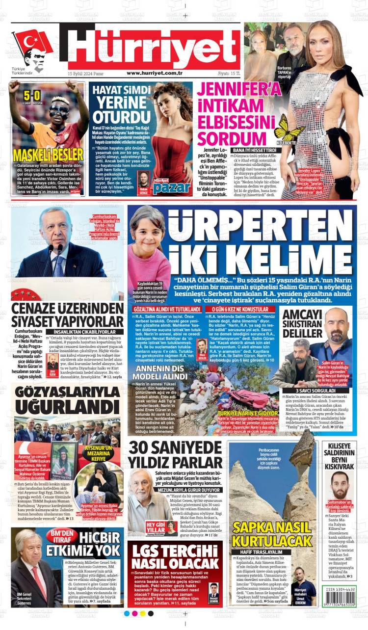 * Günün Ulusal Gazete Manşetleri – 15 09 2024Ulusal Gazetelerin 1. sayfaları Haber Merkezi Yayınlanma: 15.09.2024 - 11:50 Son güncellenme: 28.01.2025 - 00:06 Hürriyet