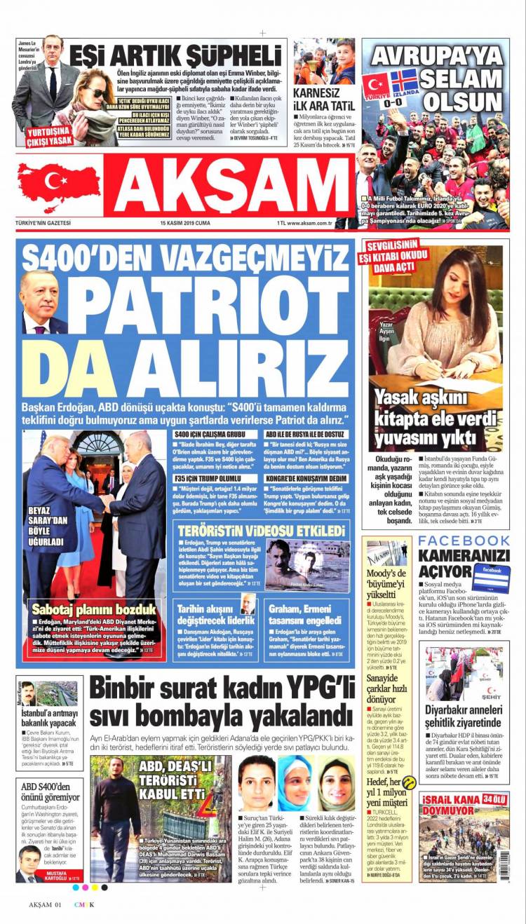 * Günün Ulusal Gazete Manşetleri – 15 11 2019Ulusal Gazetelerin 1. sayfaları Haber Merkezi Yayınlanma: 15.11.2019 - 11:50 Son güncellenme: 29.01.2025 - 00:30 Akşam