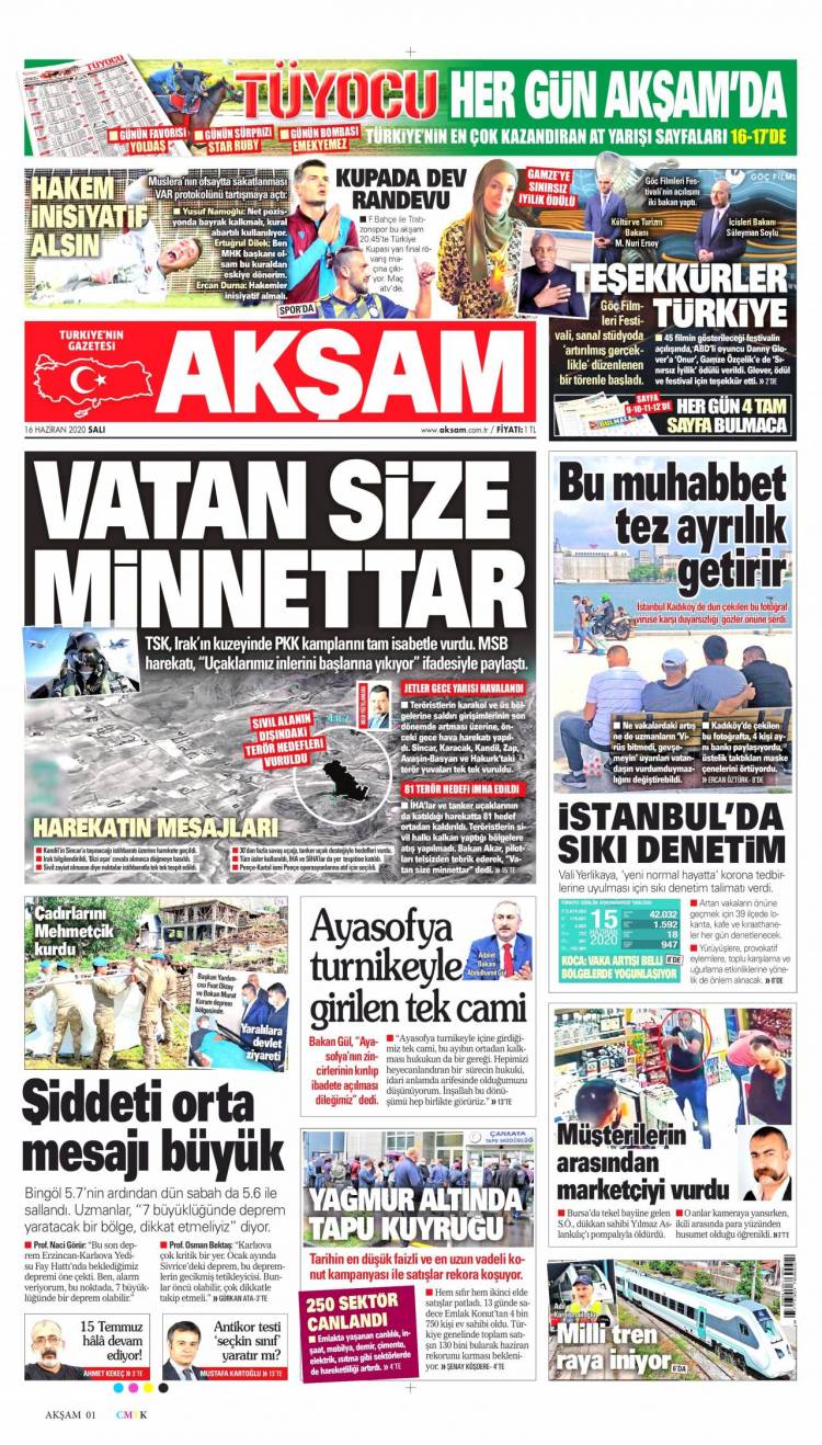 * Günün Ulusal Gazete Manşetleri – 16 06 2020Ulusal Gazetelerin 1. sayfaları Haber Merkezi Yayınlanma: 16.06.2020 - 11:50 Son güncellenme: 28.01.2025 - 21:49 Akşam