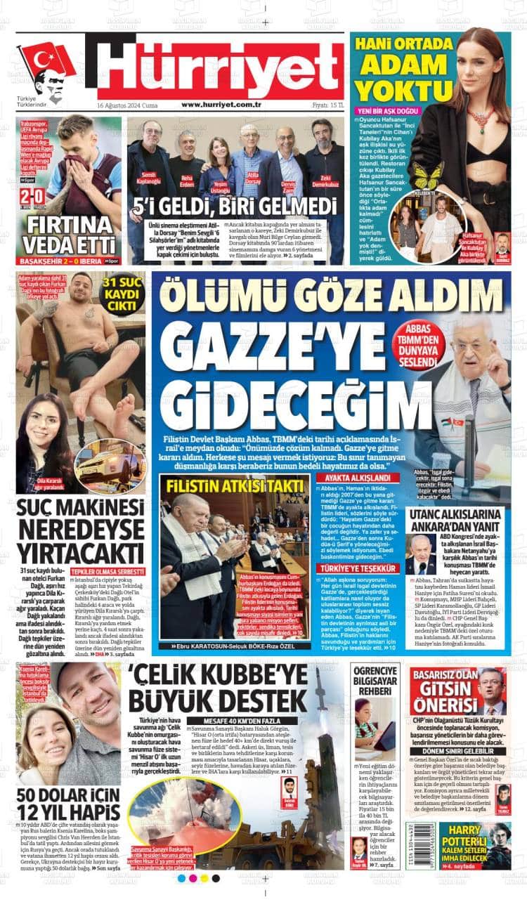 Günün Ulusal Gazete Manşetleri – 16 08 2024Ulusal Gazetelerin 1. sayfaları Haber Merkezi Yayınlanma: 16.08.2024 - 11:50 Son güncellenme: 28.01.2025 - 00:31 Hürriyet