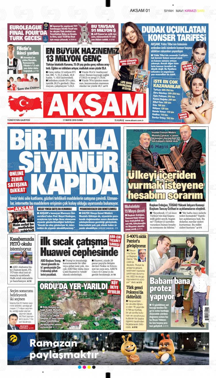 Günün Ulusal Gazete Manşetleri – 17 05 2019Ulusal Gazetelerin 1. sayfaları Haber Merkezi Yayınlanma: 17.05.2019 - 11:50 Son güncellenme: 29.01.2025 - 03:03 Akşam