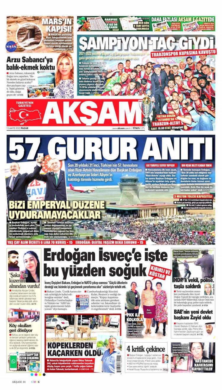 * Günün Ulusal Gazete Manşetleri – 17 05 2022Ulusal Gazetelerin 1. sayfaları Haber Merkezi Yayınlanma: 17.05.2022 - 11:50 Son güncellenme: 28.01.2025 - 11:47 Akşam