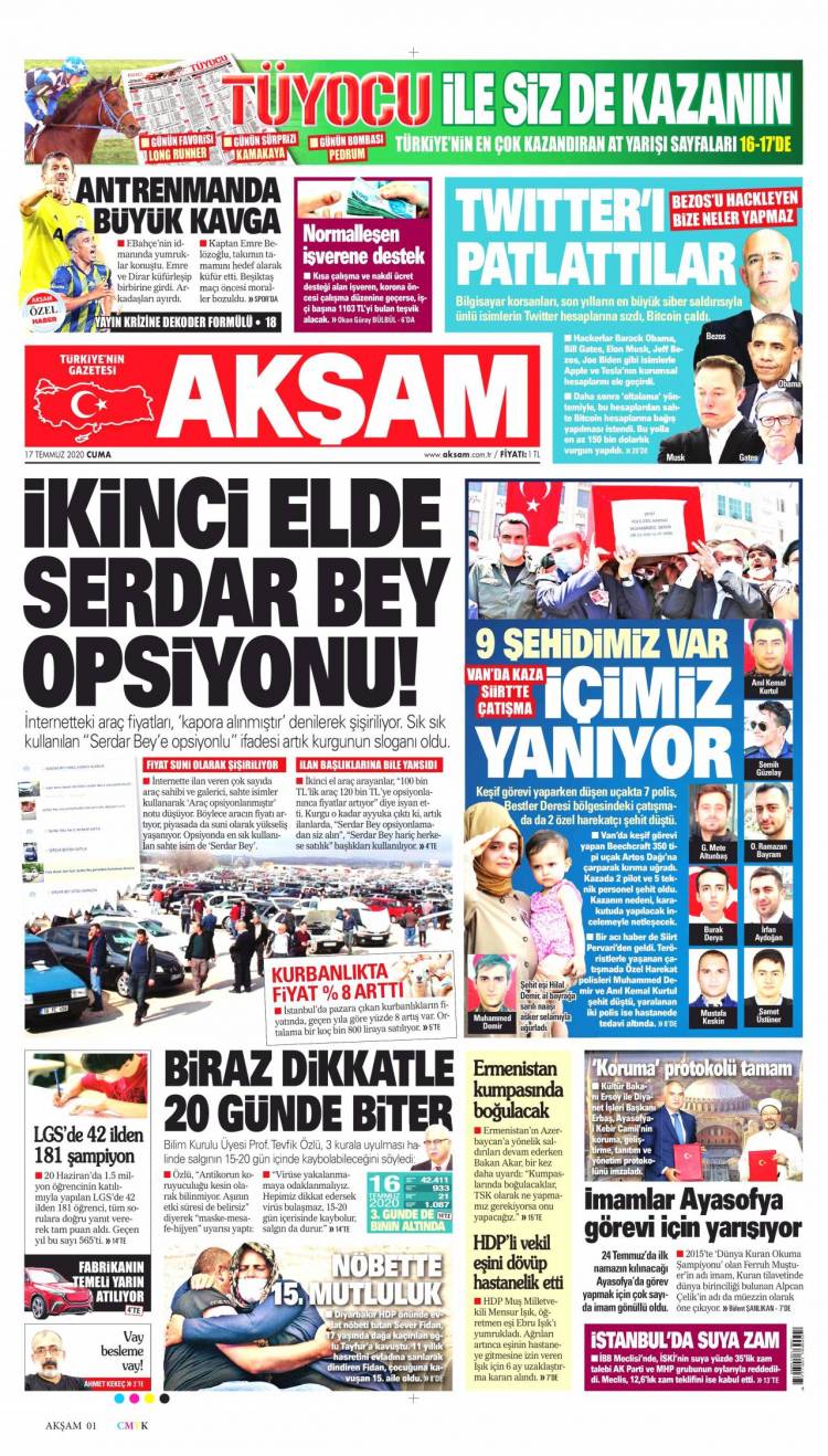 * Günün Ulusal Gazete Manşetleri – 17 07 2020Ulusal Gazetelerin 1. sayfaları Haber Merkezi Yayınlanma: 17.07.2020 - 11:50 Son güncellenme: 28.01.2025 - 21:19 Akşam