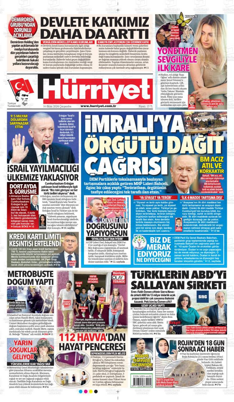 * Günün Ulusal Gazete Manşetleri – 17 10 2024Ulusal Gazetelerin 1. sayfaları Haber Merkezi Yayınlanma: 17.10.2024 - 11:50 Son güncellenme: 27.01.2025 - 23:39 Hürriyet