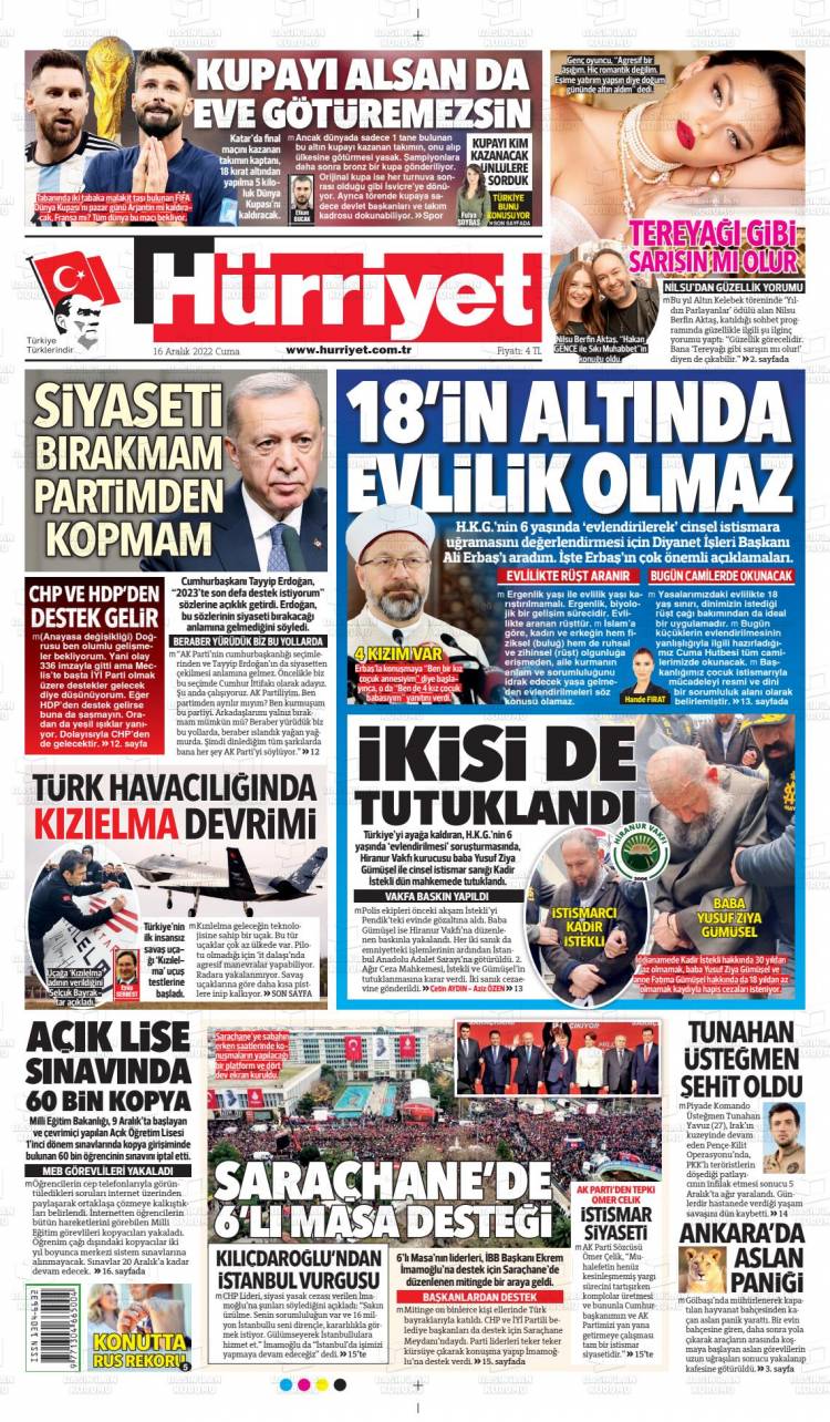 * Günün Ulusal Gazete Manşetleri – 17 12 2022Ulusal Gazetelerin 1. sayfaları Haber Merkezi Yayınlanma: 17.12.2022 - 11:50 Son güncellenme: 28.01.2025 - 08:54 Hürriyet